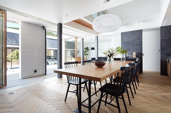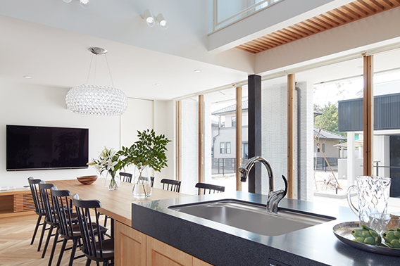 リビングに面した「内庭」にも様々なこだわりを込めています。内庭中央のシンボリックな広葉樹の植栽は、開口部が広いこの家のプライバシーを守る働きを持ち、夏には心地よい木陰をつくってくれます。また、一階の床と内庭をフルフラットにする設計手法を用いたため、屋内と外との“境目”を感じさせません。キッチンやリビング・ダイニングから内庭に向かってのびやかに繋がる広大な空間は、単に内と外を繋ぐ場ではなく、そこに家族や仲間が集い、季節ごとの愉しみ方が生まれる“みんなのお気に入りの場所”になることを願っています。