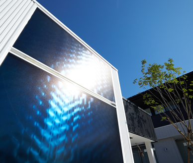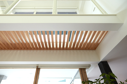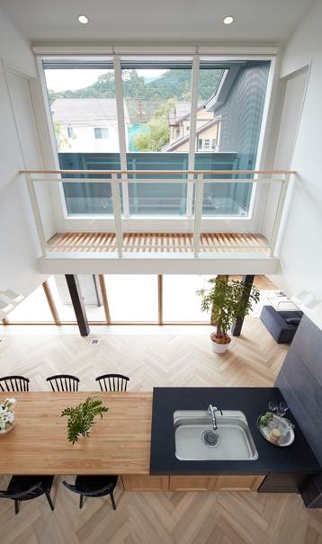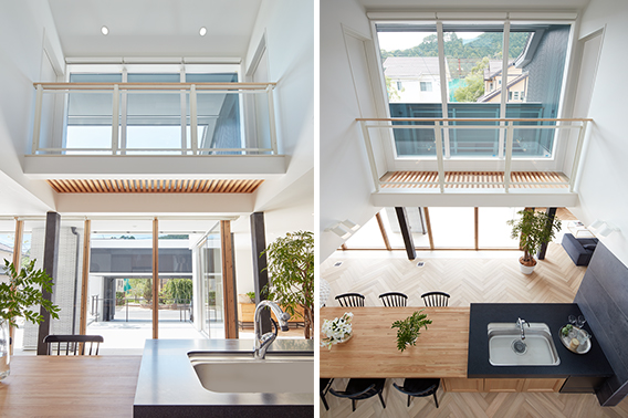 また、「パッシブデザイン」もこの家のデザイン性を語るうえで重要なキーワードです。パッシブデザインとは、特別な機械装置を使わずに、建物の構造そのもので熱や空気の流れをコントロールし、快適な住空間を生みだす建築手法のこと。GQハウスの3方向の外壁は、窓の少ない閉ざされた面。もう一方は、内庭に対して開放的な開口部を持つ面になっています。この建物形状と開口部に面する吹抜けが、1階と2階の熱的な連続性を生みだします。これにより、冬期には日射の温かさを室内の奥深くまで届けることができ、夏期には涼しい風の通り道をつくりだし、エアコン利用を抑えてくれます。また、超断熱構造を採用しているため、冬は温かい空気を外に逃さず、夏は外からの熱の侵入を防ぎます。建物自体が生き物のように積極的に快適な室温を保とうとする家、それがGQハウスなのです。