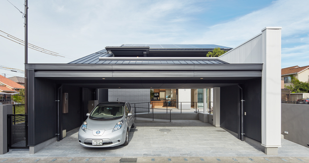 この家の最も特筆すべきポイントは、機能性をデザインに昇華させているところにあります。たとえば、駐車場と一体化した印象的な「巨大な勾配屋根」。これは、単に意匠的なものではなく、水と電気を自給自足するGQハウスのコンセプトを実現するために、雨水と太陽光を効率よく利用するという機能に基づきデザインしています。この家全体が雨水や太陽光を集めるための一つの設備であると考えたわけです。また、タイル貼りの内庭も、敷地内に降る雨を上手に集めて雨水タンクに届けるためのデザインです。そして、これら多彩な機能が盛り込まれていながら、デザイン自体は「シンプル」に見えることが、この家のシンボリックさをさらに際立たせてくれると考えています。